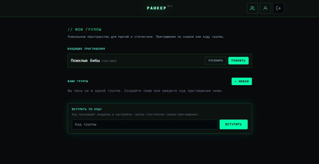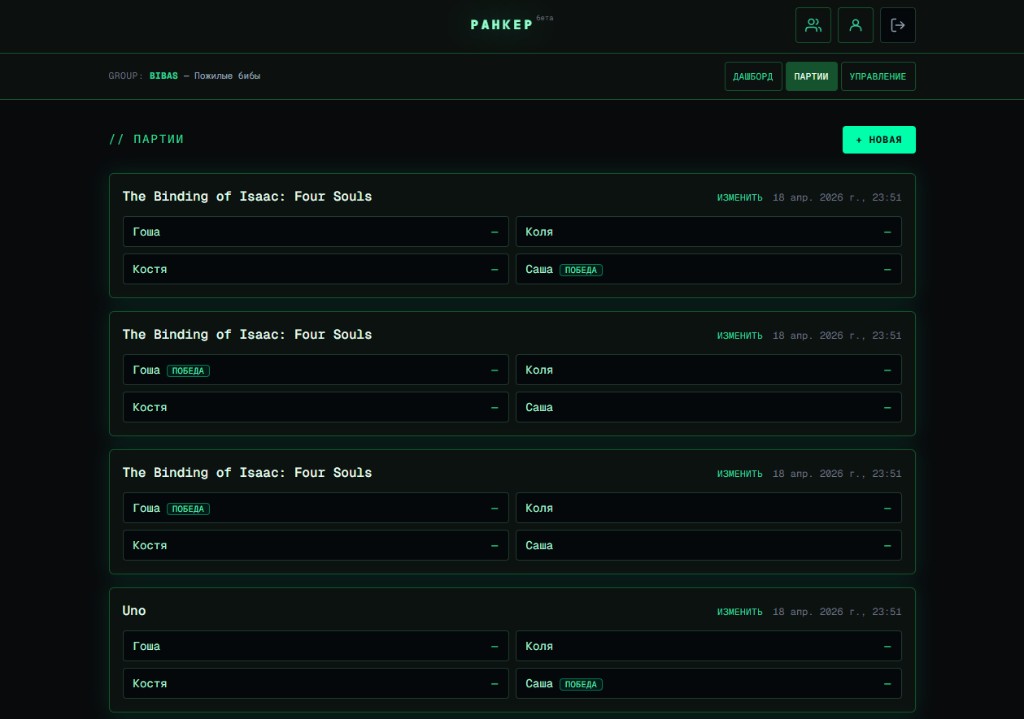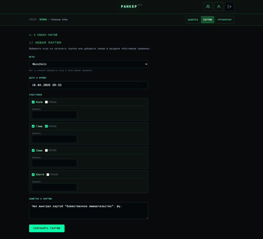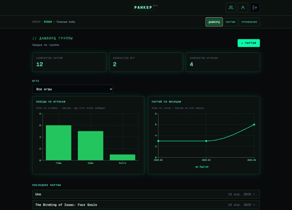 Ранкер помогает не терять результаты вечеров: одна группа — общий журнал партий и статистика. Зарегистрируйтесь и соберите стол за пару минут.